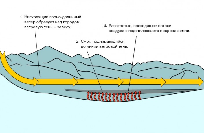 Кисамедин отмечает, что городу немного помогает "конвективное воздухозамещение". Это процесс, когда из-за разности температур холодный воздух вытесняет теплый из нижних слоев атмосферы над городом. Конвективный воздухообмен происходит в короткий период смены дня и ночи, вечером он активнее из-за накопления тепла над межгорной долиной в течение дня.