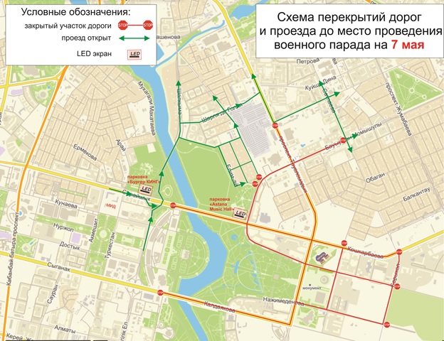 Во время проведения военного парада 7 мая будет ограничено движение с 06.00 до 15.00. В частности, будет ограничено движение от станции 40-я по улице Байыркум до мостовой развязки до улицы Кошкарбаева. От улицы Кошкарбаева от мостовой развязки до проспекта Б. Момышулы. Также будет закрыт проезд по проспекту Тәуелсіздік от улицы Б. Майлина до улицы Нажимеденова (школа). На улице Ш. Калдаякова - от моста М3 до проспекта Тәуелсіздік, по улице Нажимеденова - от улицы Ш. Калдаякова до улицы Сарыколь, по улице Байтурсынова - от улицы Кошкарбаева до улицы Сарыколь, по улице Кошкарбаева - от проспекта Момышулы до улицы Сарыколь и по проспекту Б. Момышулы - от улицы Сатпаева до улицы Дарабоз.