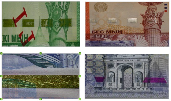 "Много информации дает изучение банкноты на просвет, это касается водяных знаков - в текущей серии это изображение мифической птицы "Самрук", цифровое изображение номинала. То есть это конкретный рисунок, а не бесформенные разводы, как это бывает на подделках. Аналогичным образом надо просмотреть сплошную магнитную и ныряющую (металлизированную) нить, выходящую на поверхность бумаги - в виде пунктиров с надписями, которые четко видны в проходящем свете, как одна целая нить с надписями. И последний метод - "Поверни" - на банкнотах имеются изображения, нанесенные цветопеременной краской. При поворачивании или наклоне банкноты изменяется цвет краски от зеленого до золотого. Речь идет об элементе СПАРК", - пояснила представитель Нацбанка.