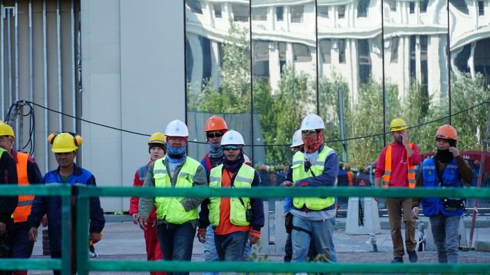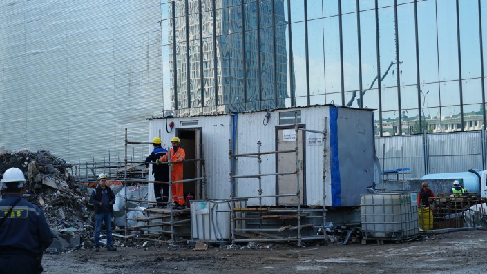 К 11 часам утра к строящемуся объекту съехались пожарные машины. Здесь уже был выстроен отряд спасателей. Служба пожаротушения и аварийно-спасательных работ столичного ДЧС устроила учения. Два года назад у этого объекта можно было увидеть почти такое же скопление пожарных и машин. Но тогда тушили реальный пожар на 25-м этаже. Сегодня условное возгорание ликвидируют на 33-м.