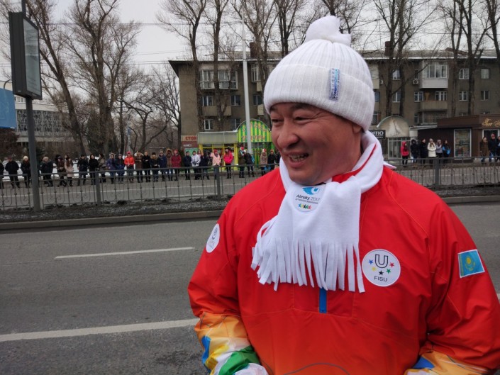 Первым, кто пронес эстафетный факел, стал Бауыржан Байбек. После окончания своего этапа, аким города передал огонь Универсиады олимпийскому чемпиону по плаванию Дмитрию Баландину.