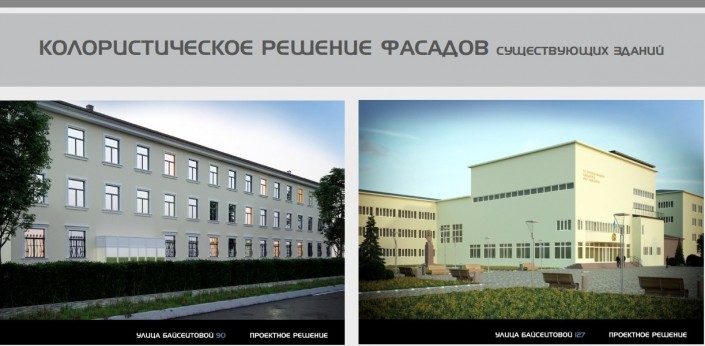 Проект преобразования жилищно-гражданских объектов улицы Байсеитовой (от улицы Кабанбай батыра до улицы Толе би). Участок - 500 метров. Площадь проектируемой территории - 3 гектара. Площадь благоустройства - 2,8 гектара. Площадь озеленения -1,5 гектара. Планируется высадить 368 деревьев.