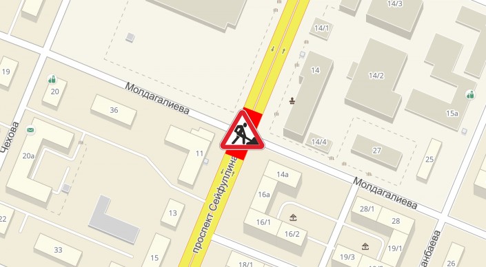 - 5 и 6 июля - пересечение улицы Молдагалиева и проспекта Сейфуллина. Автобусы №№106, 18, 34, 72, 85 будут ездить в прямом и обратном направлении по Сейфуллина - Майбороды - Акан Серы - Шолохова и далее по своему маршруту. Троллейбус №7 - разворот на остановке "Поселок Мехзавода".