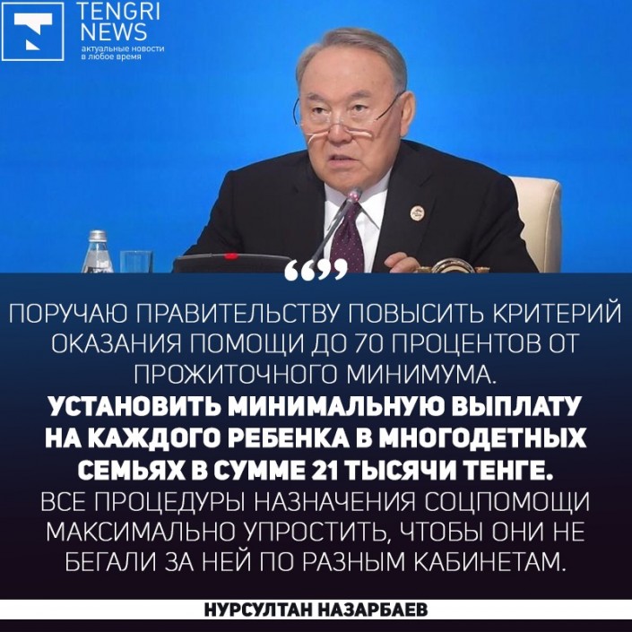 "Для адресной поддержки семей с детьми, имеющих право на получение адресной социальной помощи, установить минимальную выплату на каждого ребенка в многодетных семьях в сумме 20 789 тенге. Все процедуры назначения социальной помощи должны быть максимально упрощены и переведены в проактивный формат. При исчислении совокупного дохода таких семей нужно исключить из расчета отдельные пособия, такие как госпособия многодетным семьям и многодетным матерям, пособие по инвалидности для детей, стипендии. В результате адресной социальной помощью будет охвачено в 2019 году свыше 830 тысяч человек, в том числе почти 550 тысяч детей", - заявил Нурсултан Назарбаев.