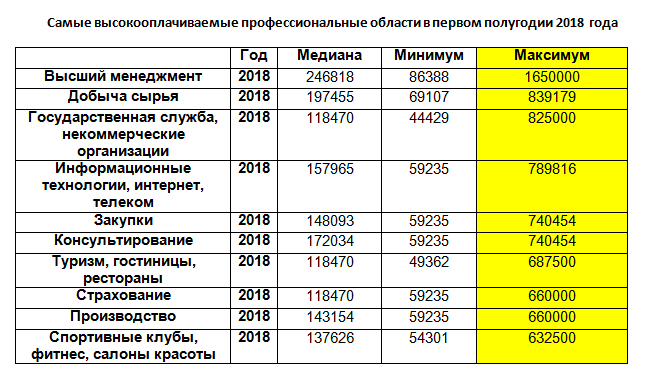 В десятку самых высокооплачиваемых профессий за первое полугодие 2018 года вошли: