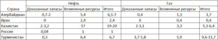 С распадом Советского Союза каспийские нефтяные и газовые запасы, доставшиеся постсоветским республикам при территориальных разделах по национальным секторам, распределились неравномерно (таблица 1). Самыми привлекательными для крупных иностранных инвесторов оказались Казахстан, Азербайджан и Туркменистан.