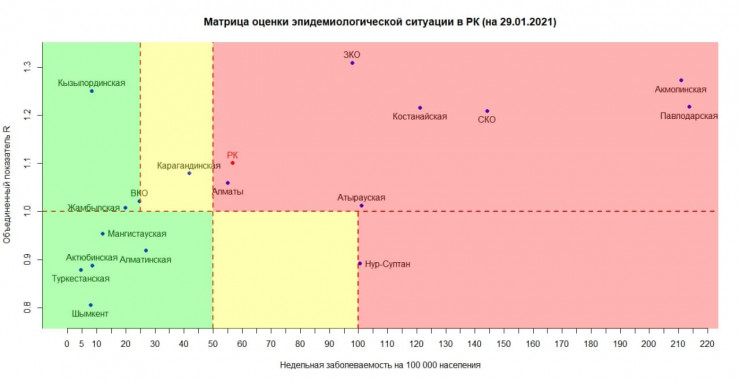 По информации, опубликованной 29 января, в "красной" зоне изменений нет: здесь находятся Нур-Султан, Алматы, Акмолинская, Атырауская, Западно-Казахстанская, Костанайская, Павлодарская, Северо-Казахстанская области. Также, судя по матрице, в ней находится Казахстан.