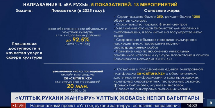 Одно из направлений проекта называется "Ел рухы" и объединяет комплекс мер по повышению доступности услуг в сфере культуры, а также продвижение отечественной культурной продукции, в том числе за рубежом.