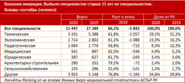 Более половины выбывших из Казахстана специалистов имели техническую (3,3 тысячи человек), экономическую (1,7 тысячи человек) или педагогическую (тысяча человек) специальности.