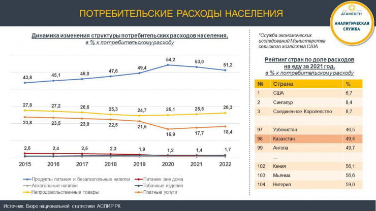 По данным Службы экономических исследований МСХ США за 2021 год, по показателю "доля потребительских расходов на продукты питания, включая безалкогольные напитки, потребляемые дома", Казахстан находился на 98-м месте среди 104 стран, включенных в исследование.