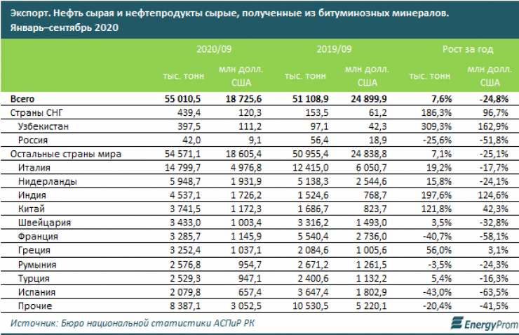 В страны СНГ была отправлено 439,4 тысячи тонн сырой нефти на 120,3 миллиона долларов. Основной импортер казахстанской нефти среди стран СНГ - Узбекистан. В остальные страны мира было отправлено 54,6 миллиона тонн нефти на сумму 18,6 миллиарда долларов. Основными импортерами стали Италия, Нидерланды и Индия.