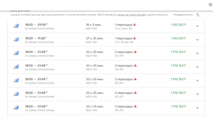 Помимо стоимости удивляет и время в пути. Например, перелет из Нур-Султана в Москву занимает в лучшем случае 10-15 часов. Все из-за отсутствия прямого авиасообщения. Авиакомпании предлагают лететь из Казахстана в Россию с пересадкой в Турции.