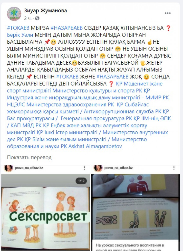 "Книга, указанная в посте, не имеет никакого отношения к казахстанским учебникам, тем более в школах Казахстана нет уроков сексуального воспитания. Содержание школьных учебников формируется в соответствии с государственным общеобязательным стандартом образования Республики Казахстан (ГОСО), типовыми учебными планами и типовыми учебными программами по каждому предмету, утвержденными МОН. В данных документах нет предмета о сексуальном воспитании", - разъяснил директор центра Гани Бейсембаев.