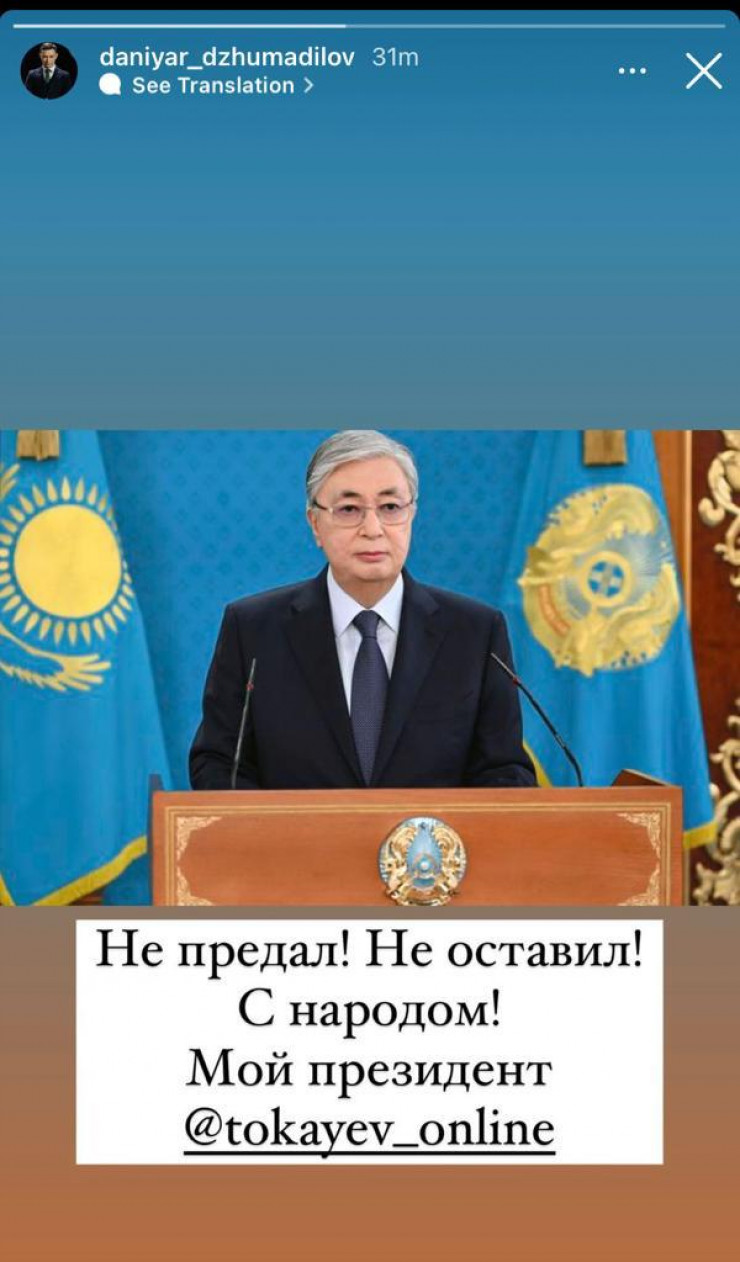 "Я рад, что в такой сложный критический момент у руля государства оказался именно он. В эти напряженные дни мы могли потерять нашу государственность. Но правильные и решительные шаги сохранили нам наш независимый Казахстан. Каждый разумный человек должен понимать, что мирными митингами воспользовались определенные силы, чтобы дестабилизировать ситуацию в стране. Захват аэропорта, акиматов, военных объектов, арсеналов оружия, попытки захватов телевизионной вышки, телеканалов и других стратегических объектов указывают на то, что в стране орудовали и продолжают совершать преступления не простые мирные демонстранты. Добропорядочные граждане никогда не стали бы уничтожать свои города, убивать молодых парней - военных и полицейских", - написал Нуртас Адамбай.