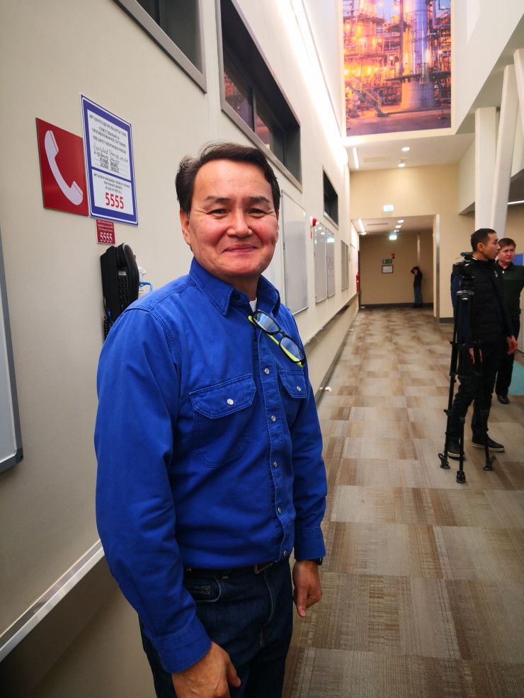 После комментариев о высокотехнологичных объектах Бауыржан Аманбай рассказывает о том, как давно он здесь работает: "Начинал на заводе КТЛ с позиции оператора установки еще 30 лет назад, со дня основания ТШО, поднялся до начальника эксплуатации завода второго поколения, а с 2020 года работаю на проекте ПБР начальником эксплуатации завода третьего поколения".