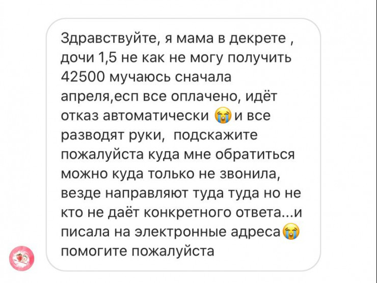 "Дочке 1,5 года, не могу получить 42 500 тенге, мучаюсь с начала апреля. ЕСП уплачен, отказ идет автоматически, и все разводят руками. Куда обратиться, куда только не звонила, никто не дает конкретного ответа", - жалуется женщина.