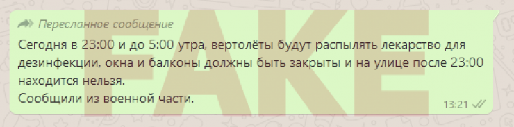 "Бүгін сағат 23.00 мен таңғы 5.00 аралығында қалада дезинфекция жүргізу үшін тікұшақтан дәрі-дәрмектер себіледі. Барлық терезе мен балкон жабық болуы тиіс, сағат 23.00-ден кейін далаға шығуға болмайды. Әскери бөлімдегілер осылай деді", - делінген хабарламада.