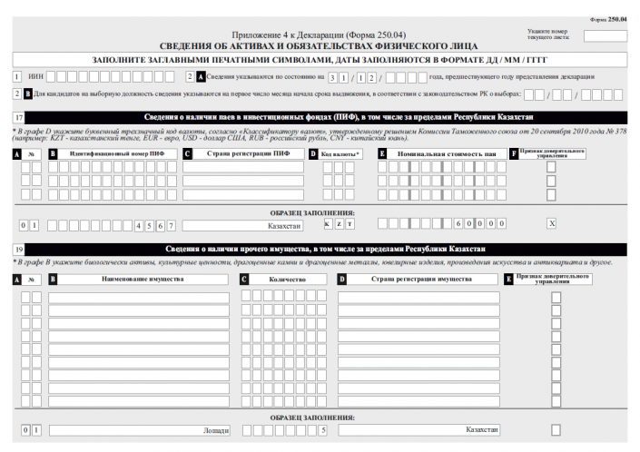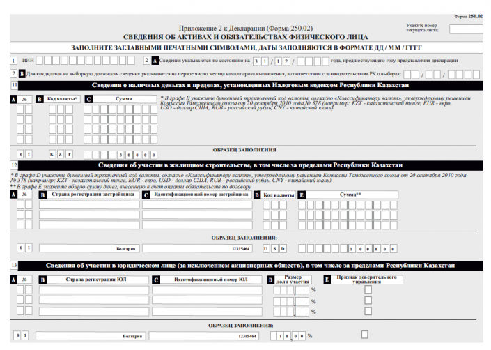 К примеру, в графе 9 "Сведения о транспортных средствах, в том числе за пределами Республики Казахстан" указывается вид транспорта (легковая, грузовая и прочее), госномер и VIN-код.