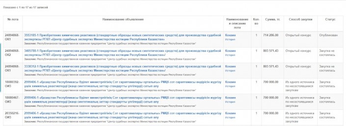 Казахстанцев удивила покупка кокаина через госзакупки. В соцсетях и мессенджерах распространяют скриншот с соответствующим объявлением. В Центре судебных экспертиз объяснили покупку кокаина на сумму 700 тысяч тенге через сайт государственных закупок, передает корреспондент Tengrinews.kz.
