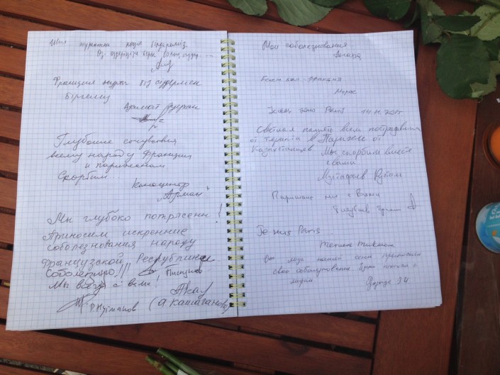 Между тем, в Астане охранники не пускают жителей столицы в здание посольства, ссылаясь на то, что это частная территория. Астанчане оставляют цветы и фотографии перед входом в посольство возле ограждения. Позже сотрудники заносят цветы в здание, где расположено посольство Франции в Казахстане.