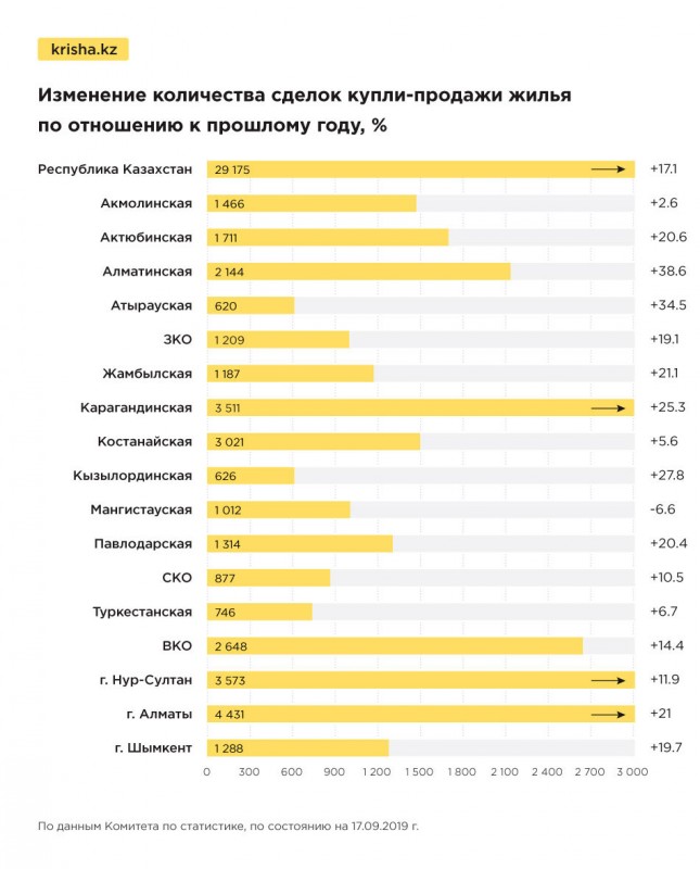 За год (август 2019-го к августу 2018-го) в Казахстане зафиксирован рост сделок купли-продажи жилья на 17,1 процента, передает корреспондент Tengrinews.kz со ссылкой на Krisha.kz.