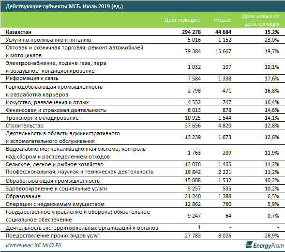 Вторую по величине долю занимают торговля и ремонт автомобилей и мотоциклов: 19,7 процента, или 15,7 тысячи. Также значительно выросло количество действующих компаний МСБ в сфере электроснабжения, подачи газа, пара и воздушного кондиционирования: доля новых компаний составила 19,1 процента, или 197 предприятий.