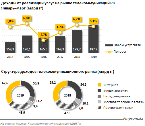 Доходы от реализации услуг телекоммуникационного рынка РК за январь–март достигли 187,9 миллиарда тенге, за год сумма выросла на 5,1 процента. В аналогичном периоде прошлого года доходы на рынке телекоммуникаций составляли 178,7 миллиарда тенге, увеличившись за год на 6,2 процента.