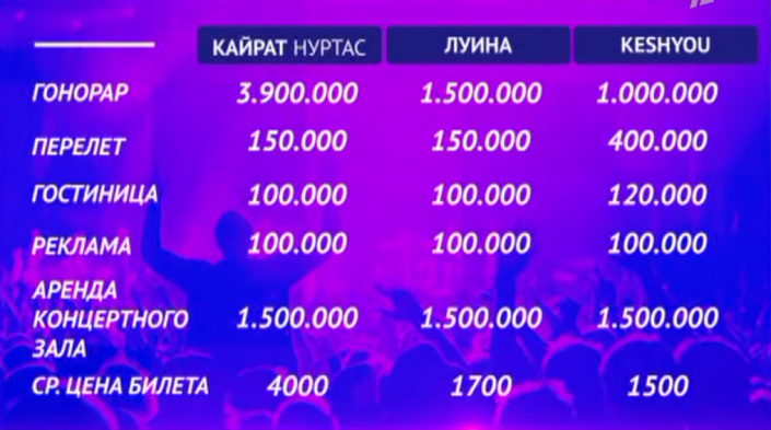 Также телеканал в своем сюжете подсчитал себестоимость билета на концерт Кайрата Нуртаса, Луины или группы "КешYou". Учтя все затраты (гонорар исполнителя, проезд и проживание певца с продюсером, реклама) оказалось, что приблизительная себестоимость билета на концерт Кайрата Нуртаса - чуть больше четырех тысяч тенге, Луины - 1700 тенге. Самыми скромными оказались девочки из нового состава группы "КешYou". Билет на их концерт организаторам обойдется примерно в 1500 тенге.