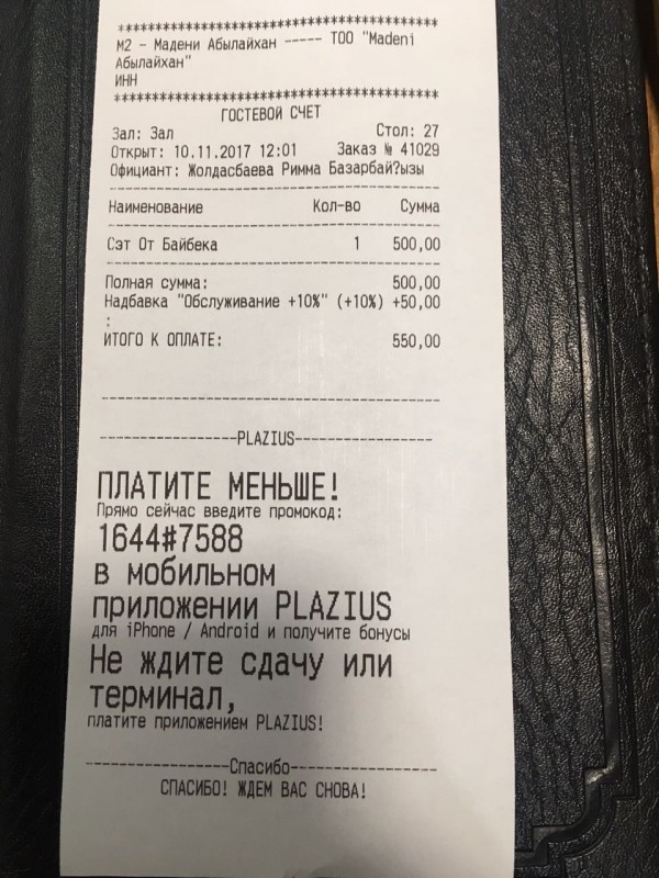 Дополнительно нужно доплатить 10 процентов за обслуживание. Итого счет составил 550 тенге.