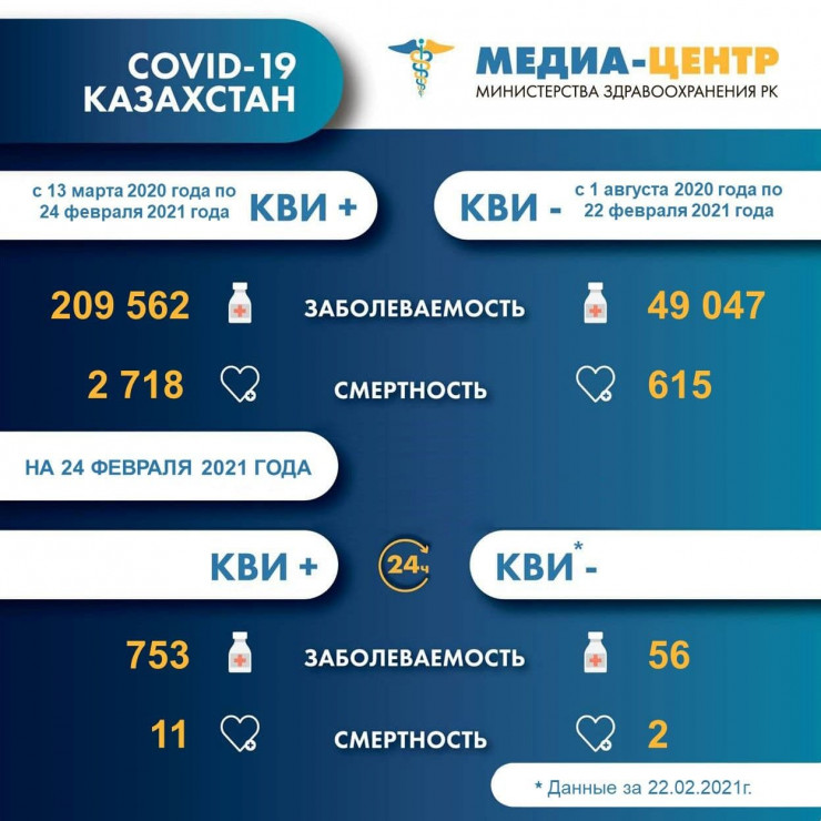 За прошедшие сутки (по данным на 23 февраля) в Казахстане зарегистрированы 753 новых случая заболевания коронавирусной инфекцией, передает Tengrinews.kz со ссылкой на МВК по нераспространению COVID-19.