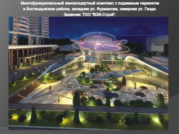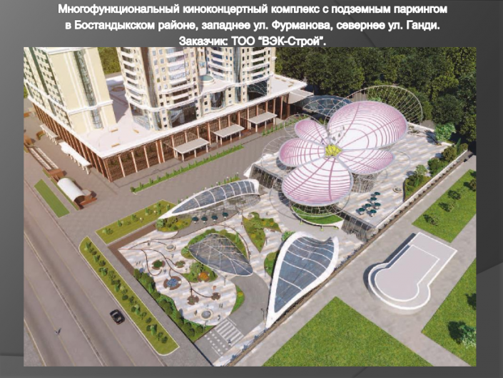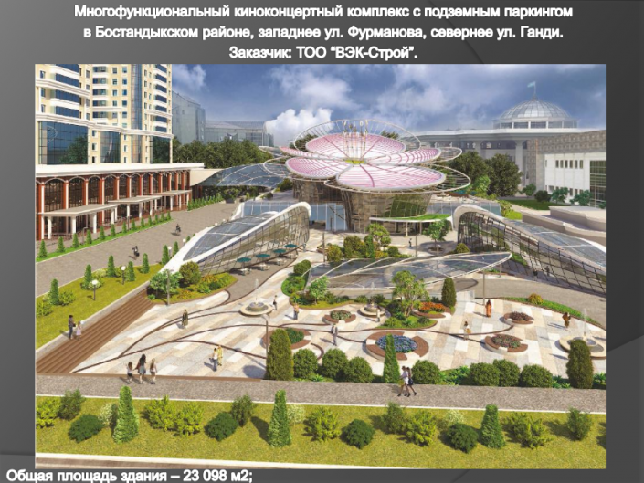 Многофункциональный концертный комплекс в виде цветка появится в районе прокуратуры Алматы по проспекту Назарбаева, угол улицы Ганди.