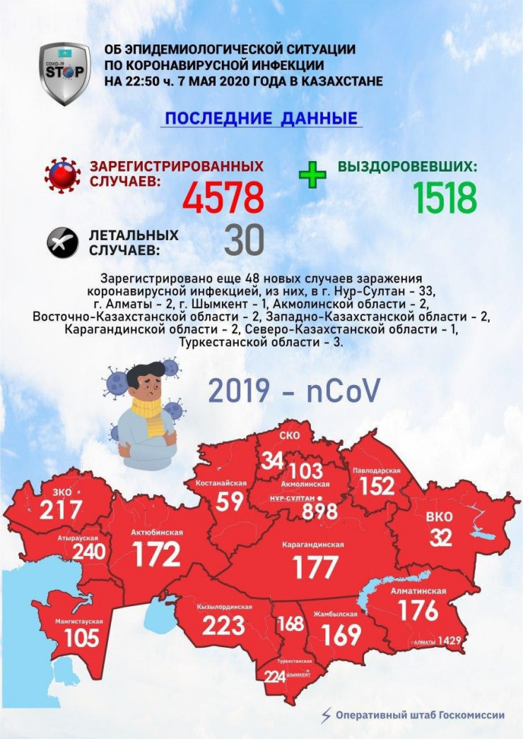 По состоянию на 22.50 часов 7 мая в Казахстане зарегистрировано еще 48 новых случаев заражения коронавирусной инфекцией, передает Оперативный штаб Госкомиссии.