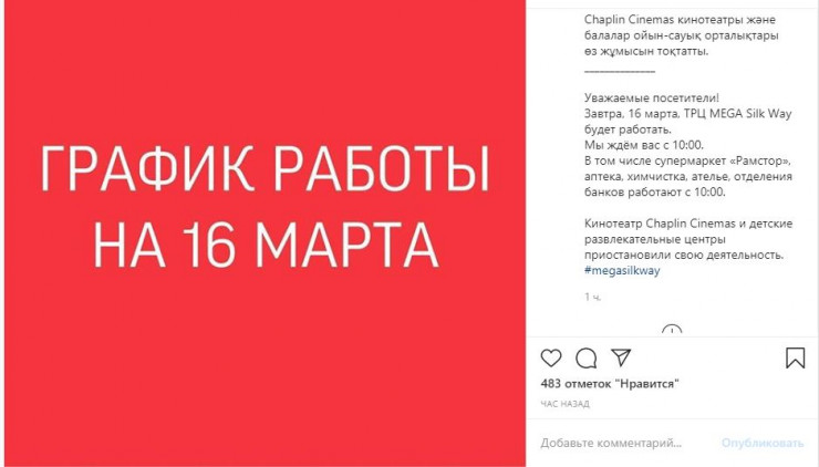 Сеть торгово-развлекательных центров Mega, ТРЦ Esentai Mall и ТРЦ "Керуен" сообщили, что 16 марта будут работать в соответствии со своим привычным графиком, передает Tengrinews.kz.