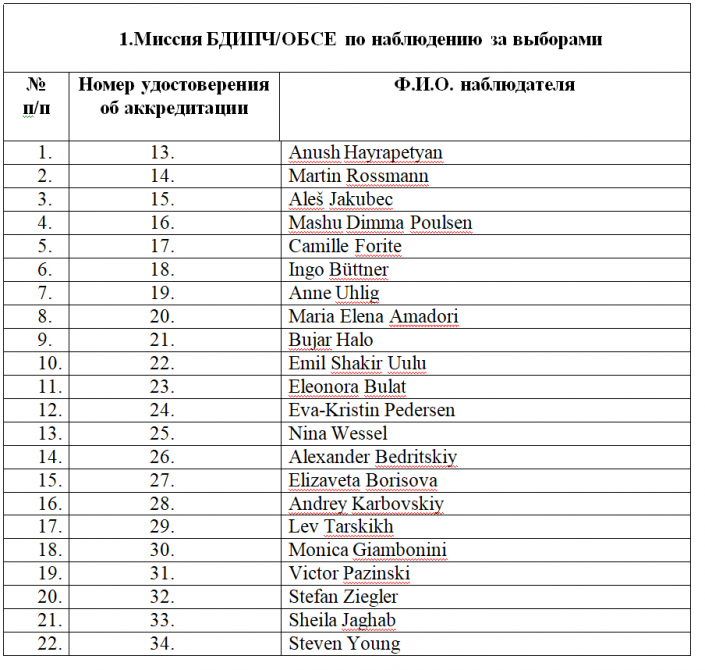 "6 мая ЦИК были аккредитованы 45 наблюдателей: семь - в составе миссии наблюдателей от СНГ, 22 - от Межпарламентской ассамблеи стран СНГ, 12 - в составе миссии ОБСЕ по наблюдению за выборами, четыре - в составе миссии наблюдателей от Организации исламского сотрудничества. 8 мая по предъявлению МИД для аккредитации внесены заявления на 22 долгосрочных наблюдателей в составе миссии ОБСЕ по наблюдению за выборами", - сообщила на заседании член ЦИК Зауреш Баймолдина.