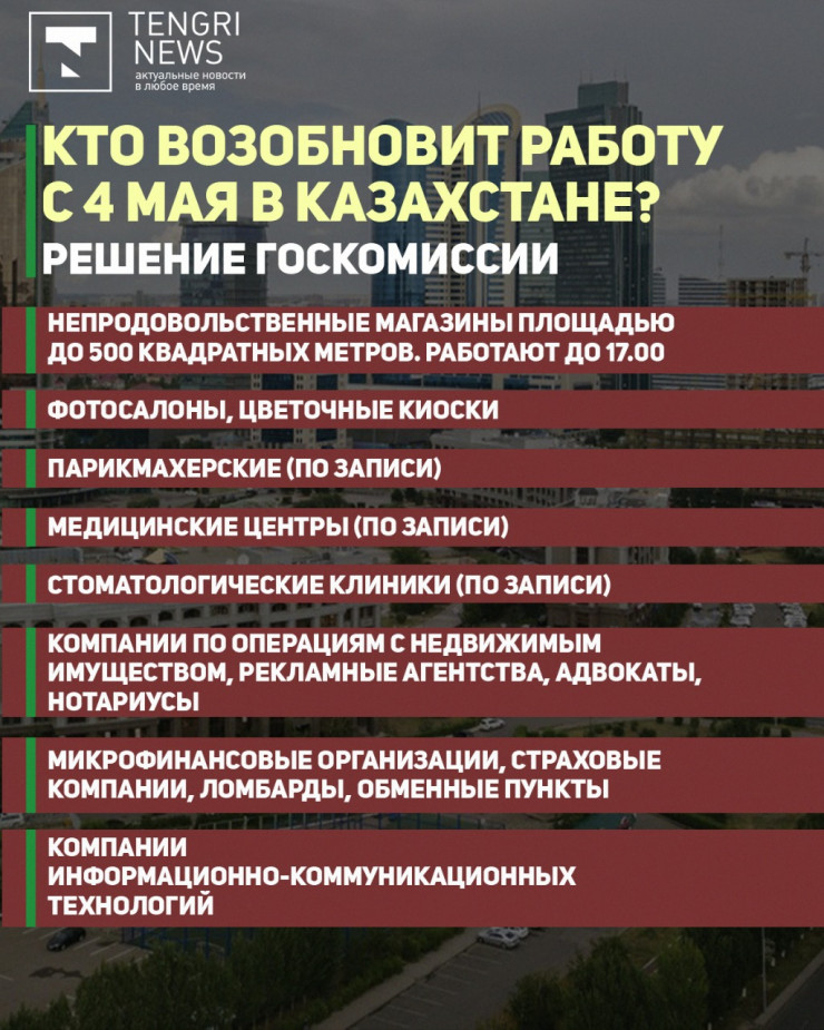 Госкомиссия утвердила перечень возобновляемых с 4 мая видов деятельности в Казахстане, передает  Tengrinews.kz со ссылкой на пресс-службу премьер-министра.
