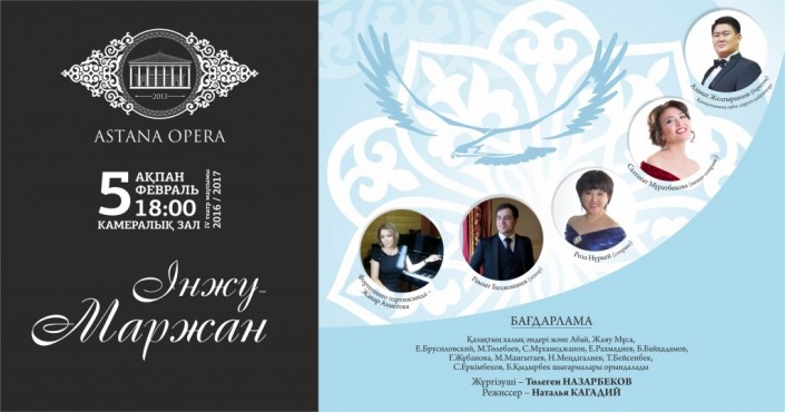 Воскресный вечер будет приятно провести в камерном зале "Астана Опера", где будут звучать лучшие произведения казахских классиков, а также получившие народную любовь произведения современных композиторов страны в концерте "Інжу-маржан". Организаторы пообещали исполнение арий и дуэтов из опер, а также произведений Абая, Жаяу Мусы, казахских народных песен, сочинений Мукана Тулебаева, Сыдыка Мухамеджанова, Еркегали Рахмадиева и других поэтов. Начало в 18.00.