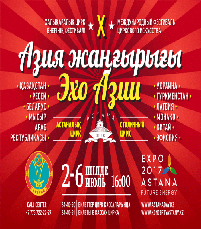 Х юбилейный Международный фестиваль циркового искусства "Эхо Азии - 2017" завершает свою программу в Астане. Всемирно известные артисты из Беларуси, Египта, Кыргызстана, Монако, России, Туркменистана, Узбекистана, Украины, Латвии, Эфиопии, Китая и Казахстана выступят под куполом столичного цирка. Посетителей ждут уникальные номера, головокружительные трюки, дрессированные животные в сочетании с 3D-лазерными спецэффектами.