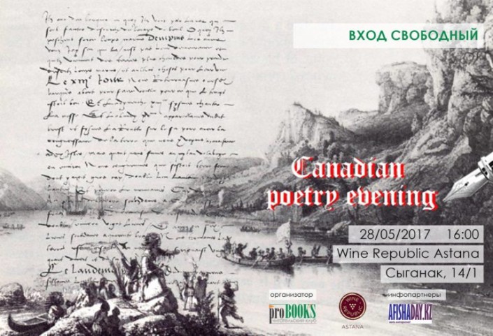 Читательский клуб Pro Books приглашает ценителей литературы на вечер канадской поэзии. На вечере посетители познакомятся с творениями франкоязычных и англоязычных канадских поэтов на языке оригинала, а также в переводе на русский язык. Пусть незнание языка не становится препоном на пути к знакомству с канадской литературой, по словам организаторов, мелодика языка, мелодия рифмы, эмоции и интонации - есть язык творчества, понятный всем и каждому. Встреча состоится в ресторане Wine Republic Astana по адресу улица Сыганак, 14/1.