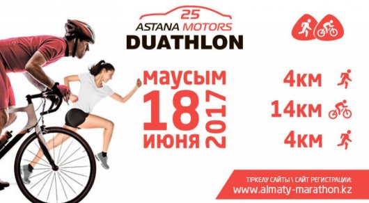 Участники стартуют 18 июня в 8.30 с открытой площадки перед ТРЦ Mega Alma-Ata. Первый этап - бег на четыре километра, далее - велопробег на 14 километров, третий этап - снова бег на четыре километра. К участию в дуатлоне приглашаются все желающие в возрасте от 18 до 60 лет при наличии велосипеда типа "шоссе" и с соответствующей соревнованиям физической подготовкой - как любители, так и спортсмены.