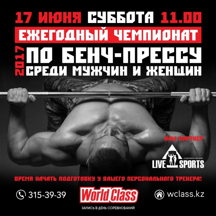 В World Class Almaty состоится ежегодный чемпионат по бенч-прессу среди мужчин и женщин. Готовы? Тренируетесь? Сколько жмете?