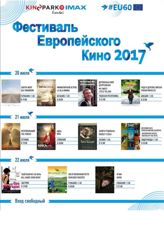 С 20 по 22 июля в г. Алматы в кинотеатре "Kinopark 11 IMAX Esentai" проходит Фестиваль европейского кино в рамках празднования 60-летия подписания Римского договора. В этом году широкой публике будут представлены лучшие кинофильмы государств-членов Европейского Союза. В программу фестиваля вошли 11 фильмов из Чехии, Австрии, Швеции, Эстонии, Испании, Словении, Германии, Франции, Румынии, Словакии и Латвии. Организатором фестиваля выступает Представительство Европейского Союза в Казахстане.