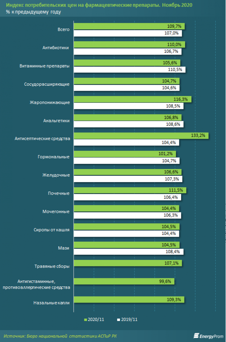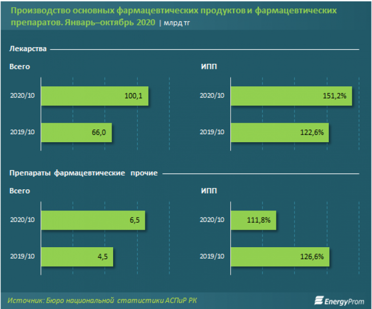 Так, в январе – октябре 2020 года в Казахстане произвели основных фармацевтических продуктов на 109,6 миллиарда тенге - на 44,7 процента больше, чем годом ранее, в денежном выражении. Рост в реальном выражении составил 39,7 процента.