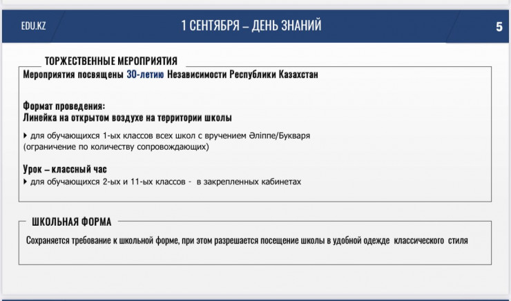 "Линейки в школах в традиционном формате пройдут только для первоклассников с соблюдением санитарных норм. Детям вручат их первые книги - "Әліппе" и "Букварь". Для обучающихся со 2 по 11 классы будут организованы классные часы в кабинетах", - сообщил глава МОН на заседании правительства.