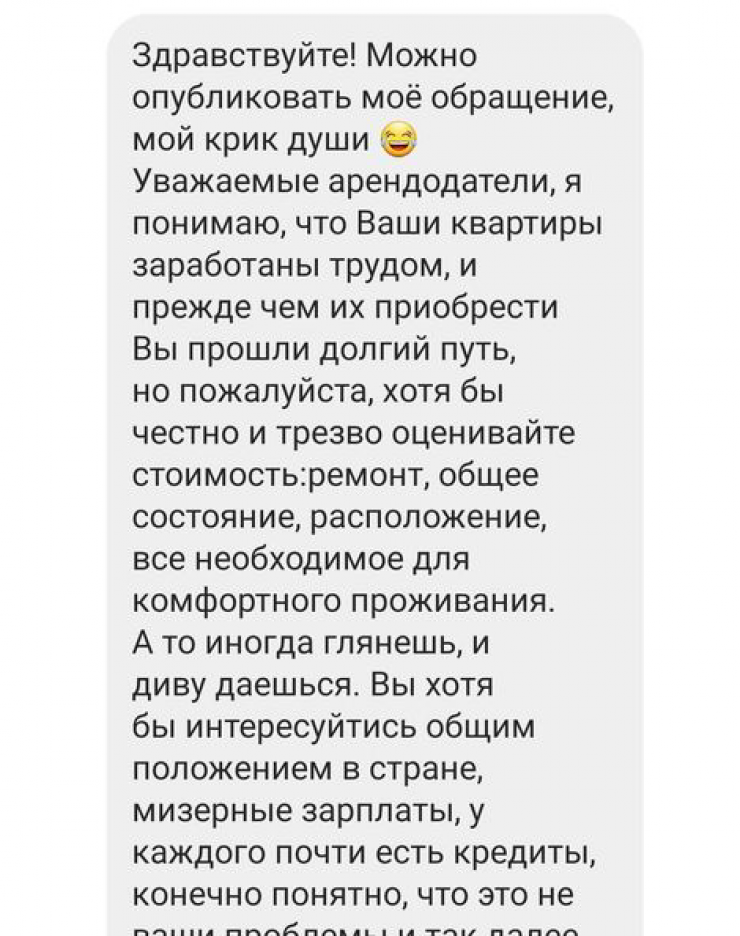 "Вокруг все подорожало: лекарства, продукты, мебель, стоимость чернового жилья. Все, кроме зарплаты людей. Хозяева, которые покупают черновые квартиры, вкладываются, ждут завершения строительства. Им пришлось повысить цены в связи с подорожанием ремонта и мебели. Пишут мне, что приходится делать ремонт, а чтобы сделать ремонт и поменять мебель, нужно повысить аренду, потому что хочется, чтобы квартира была в хорошем состоянии.