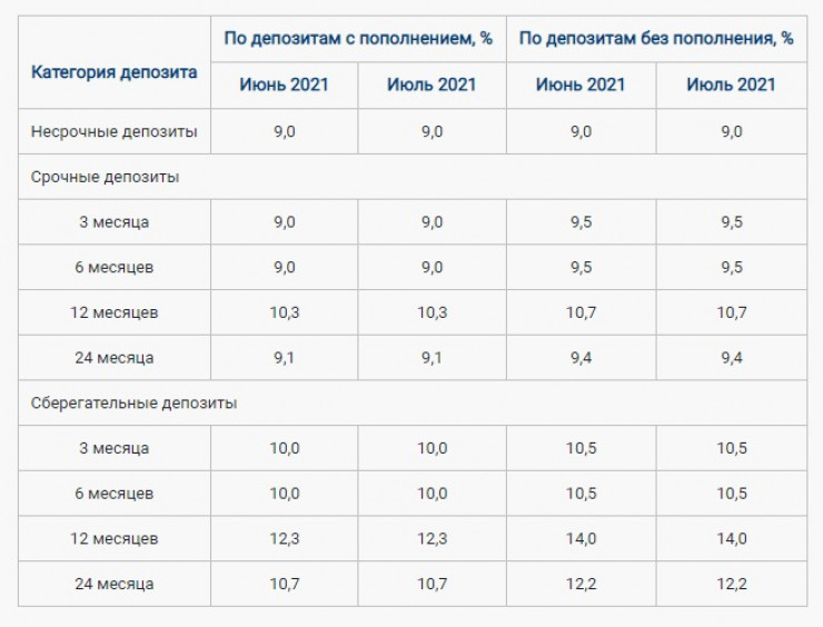 Казахстанский фонд гарантирования депозитов (КФГД) объявил максимальные ставки по депозитам на июль 2021 года, передает Tengrinews.kz со ссылкой на сайт фонда.