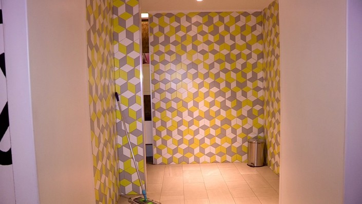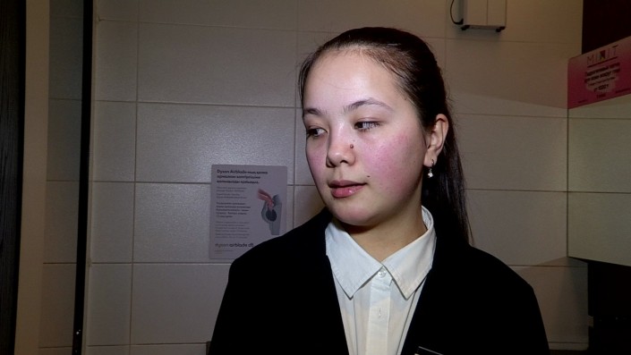 Сотрудница охраны Ботагоз Алихан показывает место, где принимала роды у посетительницы торгового центра.