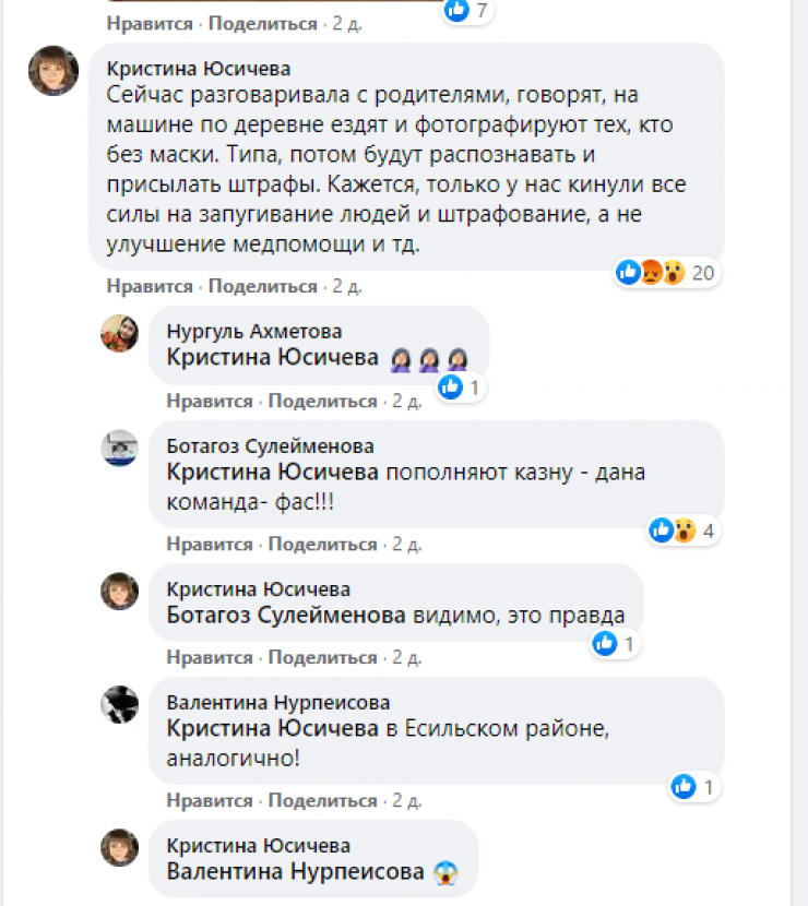 "Жаңа ғана ата-анаммен сөйлестім, ауылда көлікпен жүріп, маскасыз адамдарды суретке түсіріп алады екен. Кейін оның кім екенін анықтап, айыппұл салады. Бізде ғана медициналық көмекті жақсартудың орнына, адамдарды қорқытып, айыппұл салуға тырысатын сияқты", - дейді желі қолданушысы.