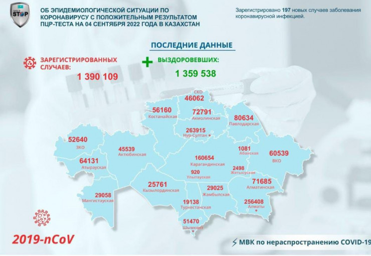 За прошедшие сутки 4 сентября в Казахстане зарегистрировали 197 заболевших коронавирусной инфекцией,  передает Tengrinews.kz со ссылкой на данные Межведомственной комиссии по нераспространению COVID-19.