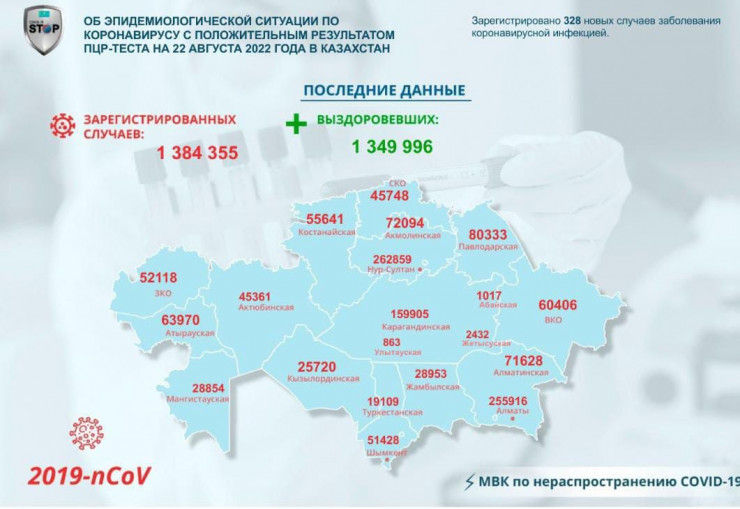В Казахстане за прошедшие сутки зарегистрировано 328 новых случаев заболевания коронавирусной инфекцией, передает Tengrinews.kz со ссылкой на МВК по нераспространению COVID-19.