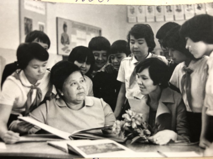 Урок арифметики в меркенской средней школе. На девочке - пионерский галстук и платье с цветочным узором.